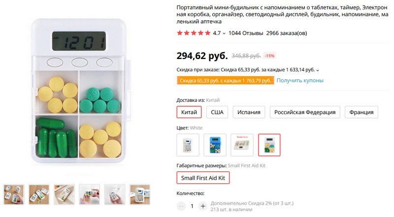 Полезная штука для тех, кто забывает вовремя принимать таблетки (я знаю, что у некоторых это реальная проблема) - органайзер для таблеток с будильником.  Есть доставка из России, но ее выбирать не надо - доставка стоит диких денег. А из Китая - бесплатно. Четыре разных варианта устройства по одной цене.