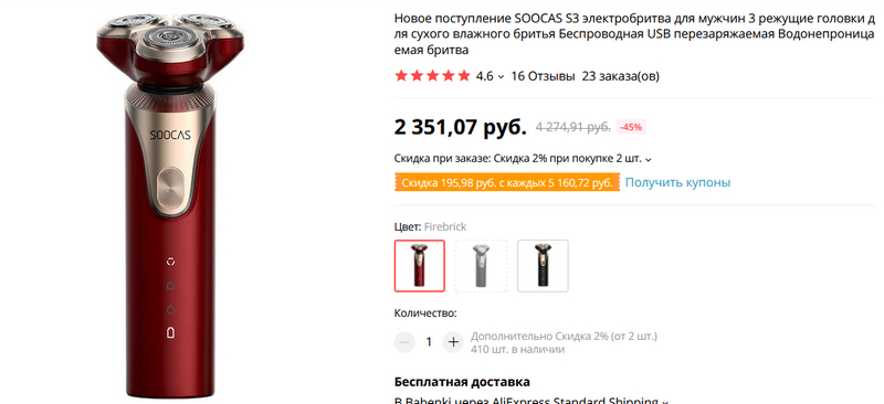 Это я не мог не заказать - новое поколение электробритвы Soocas S3. Для сухого и мокрого бритья, заряжается через USB, обещают неимоверно нежное бритье и однулянсьон на дому. Что такое ондулянсьон - точно не знаю, но явно что-то китайское. Посмотрим, проверим.