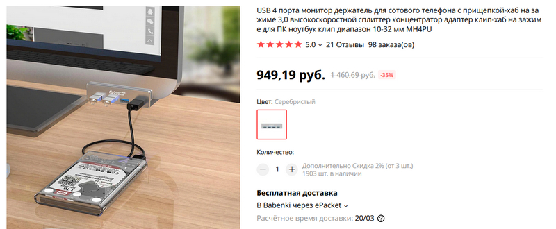 USB-хаб на 4 порта USB 3.0 от известного производителя Orico. Он интересен тем, что его можно закрепить на краю стола или прямо на мониторе. Заказал пару штук, мне такие нужны.