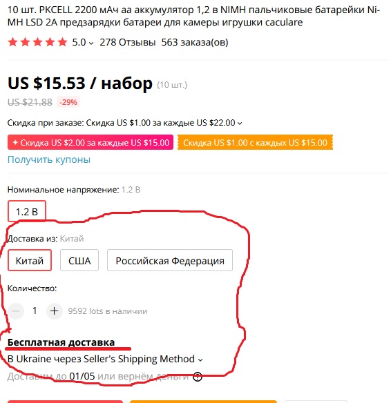 Если выбирать доставку из Китая, то будет бесплатно. Вот, к примеру, АА(10 шт. по 2200 мАч)