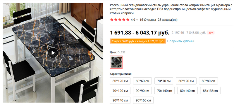 Коврик-клеенка с имитацией мрамора. Можно заказать с размером вровень с поверхностью стола - будет прикольно смотреться. Там не только те размеры, которые указаны, продавец пишет, что можно заказать свои размеры. Я такой хочу для уличного стола - должно забавно смотреться. А то обычная клеенка - как-то скучно.
