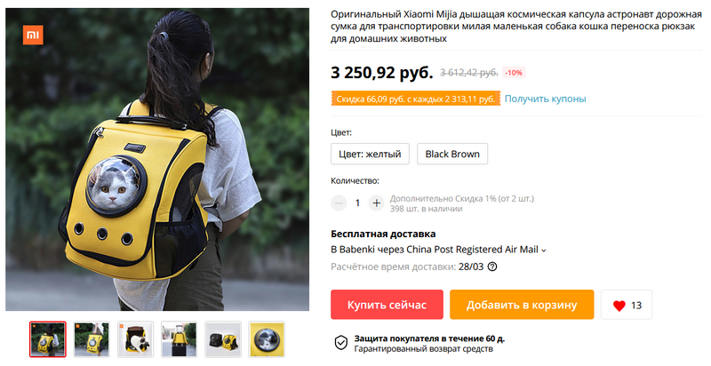 Рюкзак для перевозки кошек и маленьких собак от Xiaomi. Называется "кошка-космонавт". Вентиляционные отверстия, отличный обзор планеты Земля, эффектно смотрится. Кот Бублик одобряет.