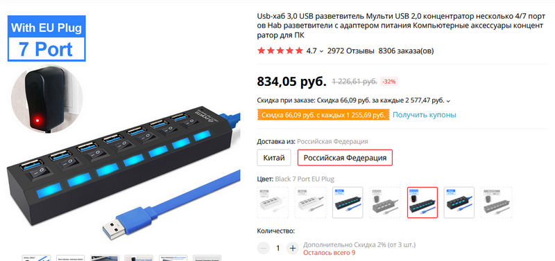 Для тех, кому приходится подключать много устройств по USB - 4-х и 7-портовые концентраторы со своим питанием и с возможностью отключения каждого порта. На российском складе осталось всего-ничего, в Китае - сколько угодно.