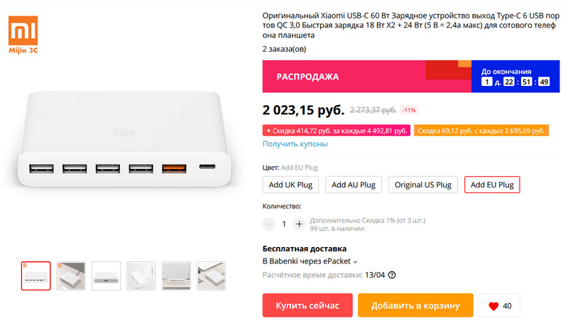 Зарядный шестипортовик от Xiaomi - удобная штука для тех, кому много чего нужно заряжать. Есть порт с поддержкой быстрой зарядки QC 3.0 и порт Type-C.