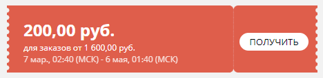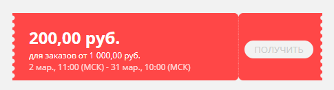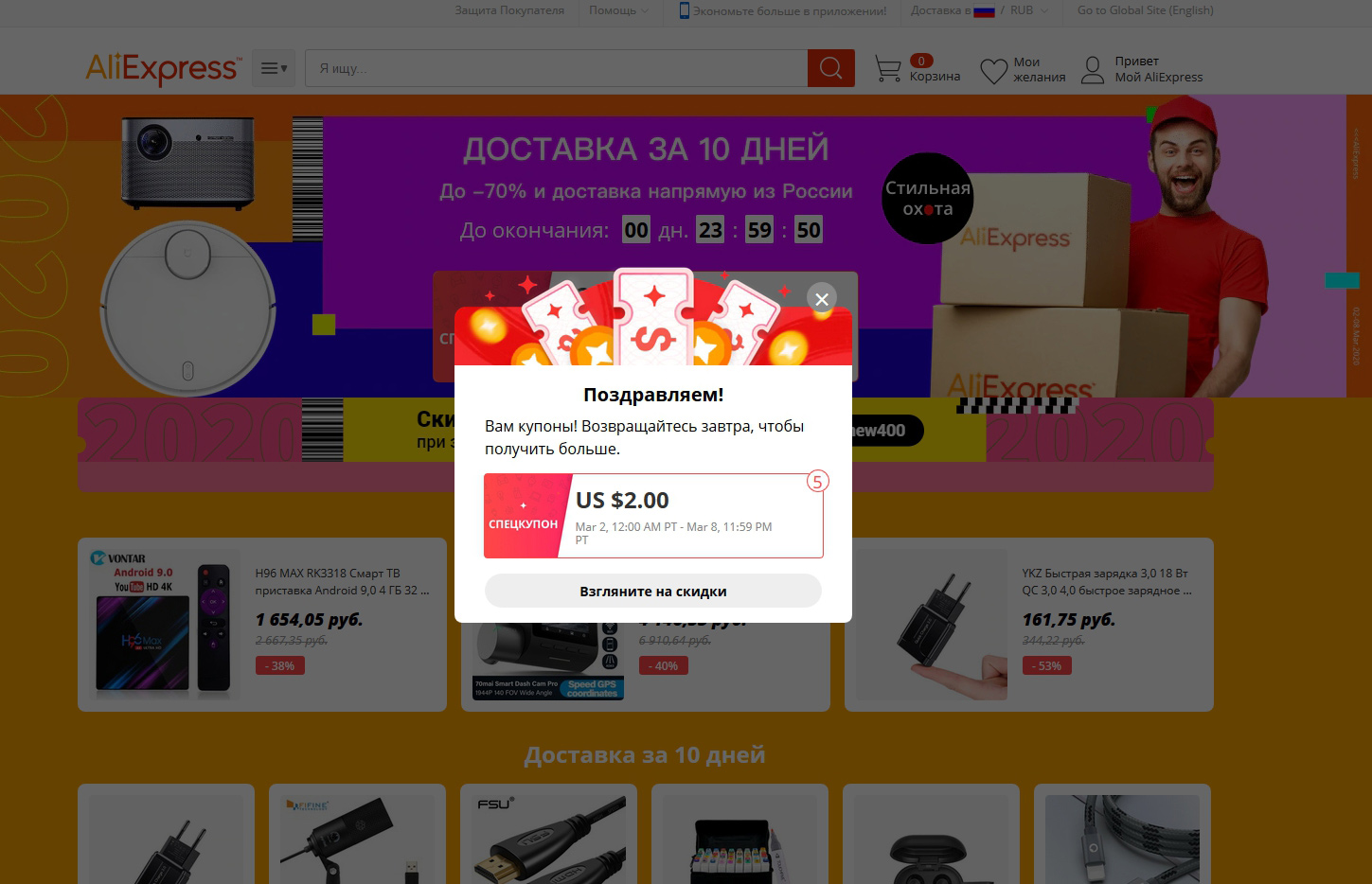 В течение Срока проведения Акции (см. п. 2 ниже), каждый Участник, имеющий право участвовать в Акции (как определено ниже в п.5) и выполнивший условия, указанные в п.6, получает купон “10 лет Алиэкспресс” (далее – "Купон"). Купон предоставляет скидку в размере 2 000 (две тысячи) рублей на любые товары в рамках распродажи “10 лет Алиэкспресс” на Сайтах, при условии минимальной стоимости покупки в 10 000 (десять тысяч) рублей. Купон можно использовать на Сайтах в период с 27 марта 2020 года по 31 марта 2020 года. Общее количество купонов ограничено. Каждый Участник может получить не более 1 (одного) купона в течение Срока проведения Акции.