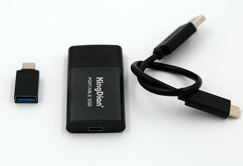 Комплект очень правильный: сам внешний SSD, кабель USB - Type-C плюс еще есть переходник с USB Type-A на Type-C, то есть этот кабель также можно превратить в Type-C - Type-C.