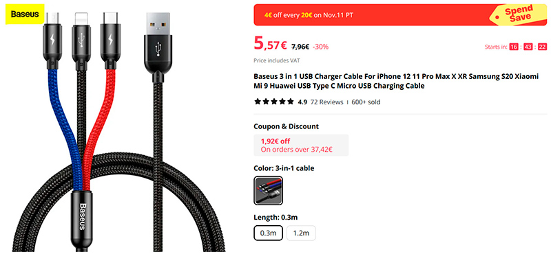 Из универсальных кабелей "3 в 1", когда у одного кабеля сразу три разных головки для зарядки, мне больше всего нравится вот этот вариант от Baseus. Тут три головки - microUSB, Type-C, lightning, при этом каждая головка имеет свой цвет кабеля - не перепутаете. Также естьт два варианта длины: 30 см и 1,2 метра.