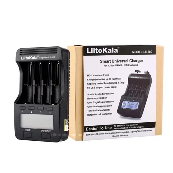 Зарядное устройство с возможностью одновременной подзарядки от 1 до 4 аккумуляторов практически всех размеров ( АА, ААА, A, SC, С (R14) и другие.). С 4-мя каналами с функцией заряда, разряда и тестирования аккумуляторов, определения внутреннего сопротивления, LCD дисплеем с о отключаемой подсветкой.. Каждый слот самостоятельно отключается при достижении максимального уровня заряда. Поддерживает зарядку Li-ion (литий-ионных), NiCd (никель-кадмиевых), NiMH (никель-метал-гидридных) аккумуляторов. Определяет реальную емкость аккумуляторов. Также есть возможность устранения “эффекта памяти” у Ni-Cd и Ni-MH аккумуляторов. С помощью этого зарядного можно "стартануть" полностью севшие аккумуляторы, а также обнаружить неисправные. Также может выполнять функцию Power Bank. Ток заряда: до 1A. Есть возможность подключить через адаптер к автомобилю. Питание на входе: DC 12V 2A.