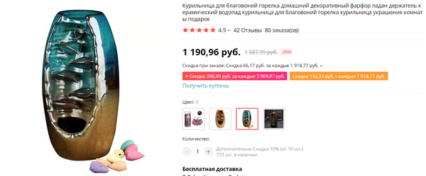 В магазине на Facebook за нее хотели аж $75, но я был уверен, что у наших друзей-китайцев найду сильно дешевле. И действительно, по запросу "Mountain River Handicraft Incense Holder" вылезают сотни предложений самых разнообразных конфигураций, расцветок и материалов.