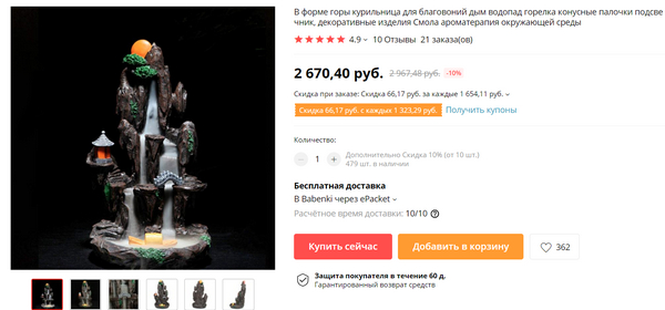 Вот точно такой же водопад как в ролике - за $18. Я его себе и заказал. Они есть трех разных расцветок. Плюс там за 790 рублей еще можно заказать банку со 168 ароматными пирамидками.