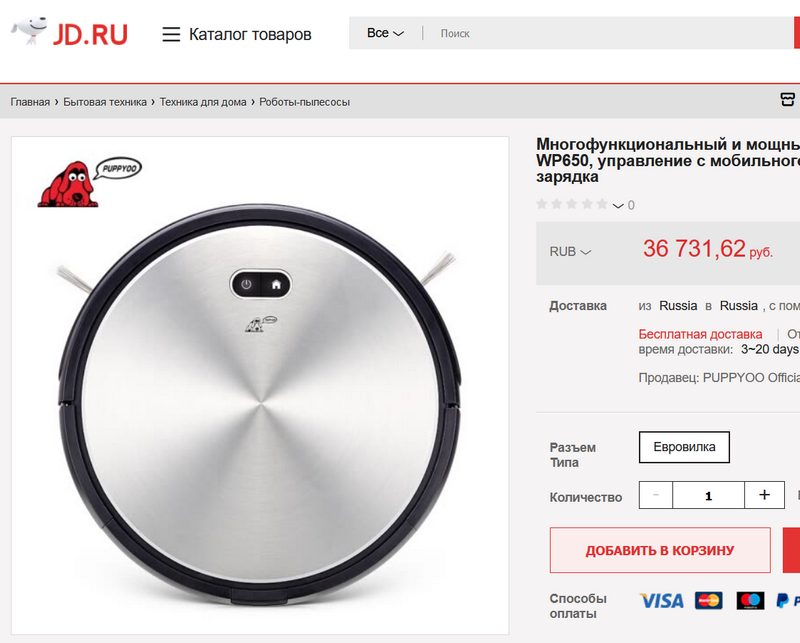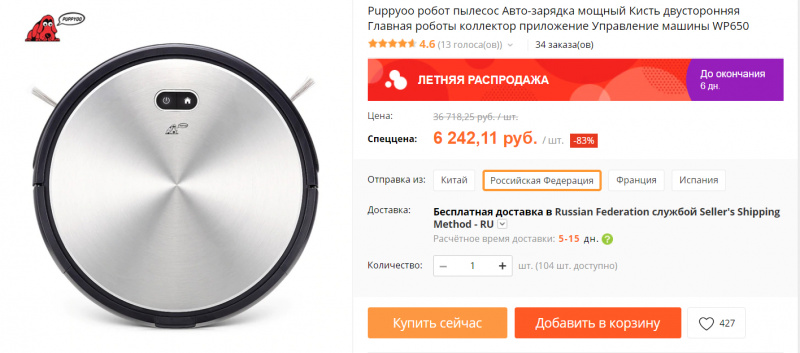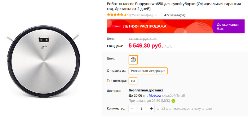 А вот на что скидка есть очень даже хорошая - так это на дешевый робот-пылесос Puppyoo wp650. Он на Tmall стоит всего 5500 рублей с доставкой с российского склада.