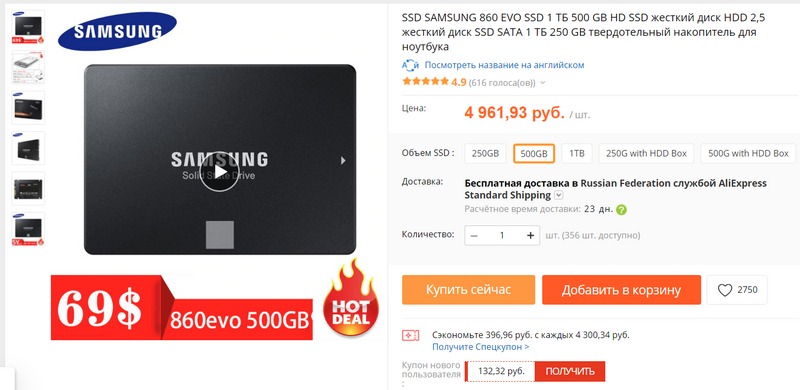SSD Samsung 860 EVO (а они реально хороши, сам давно использую) - на 250, 500 GB и 1 TB (этот уже очень дорогой). Под систему и приложения хватает 250 ГБ. 3100 рублей для 250 ГБ, 4900 для 500 ГБ. На Яндекс.Маркете примерно на тысячу каждая версия дороже. А гарантия все равно самсунговская.