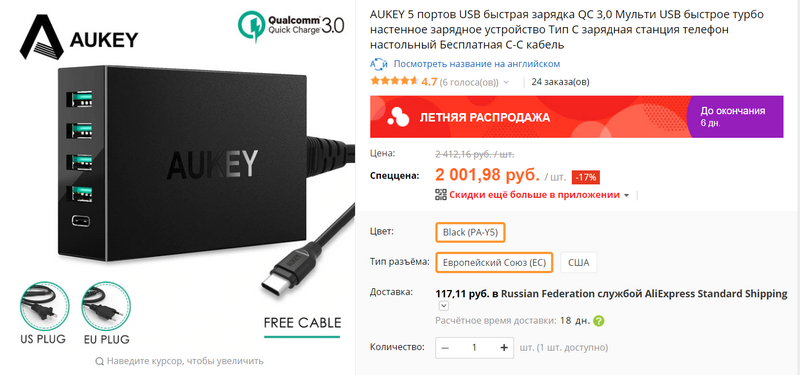 Из современных адаптеров для зарядки - я себе взял вот такой новенький Aukey (один из лучших брендов для подобных устройств), у которого 4 порта USB, порт Type-C и все порты поддерживают QC 3.0. Такая штука и дома покрывает все потребности, и в поездке.
