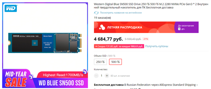 Для тех, кому нужен SSD M.2 - вот совсем недорогой вариант. 3500 за 250 ГБ и 4684 за 500 ГБ - это совсем недорого.