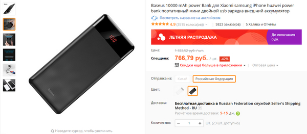 Симпатичный Baseus на 10000 мАч с дисплеем с поставкой с российского склада - на 300 рублей дешевле, чем на Яндекс.Маркете.