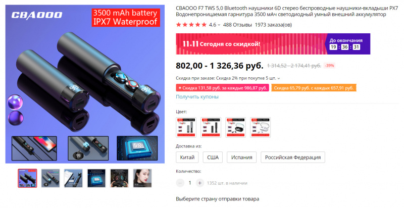 Тыкаем в третий комплект - вот они стоят 802 рубля. Но это же, извините, совершенно другая модель! Никакого aptX у нее нет, аккумулятор тут 500 мАч, а не 3500, как в заголовке, и водонепроницаемости никакой нет. Как узнать их характеристики? Да никак, характеристики - для модели за 1252 рубля.