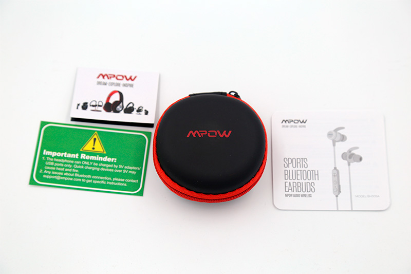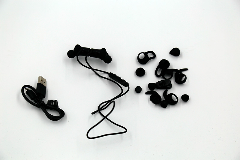 В чехле - сами наушники, зарядный кабель и довольно богатый комплект дополнительных амбушюр и ушных крючков различных размеров, а также защелка-держатель. Всего получается четыре комплекта амбушюр и крючков (включая те, которые на самих наушниках).