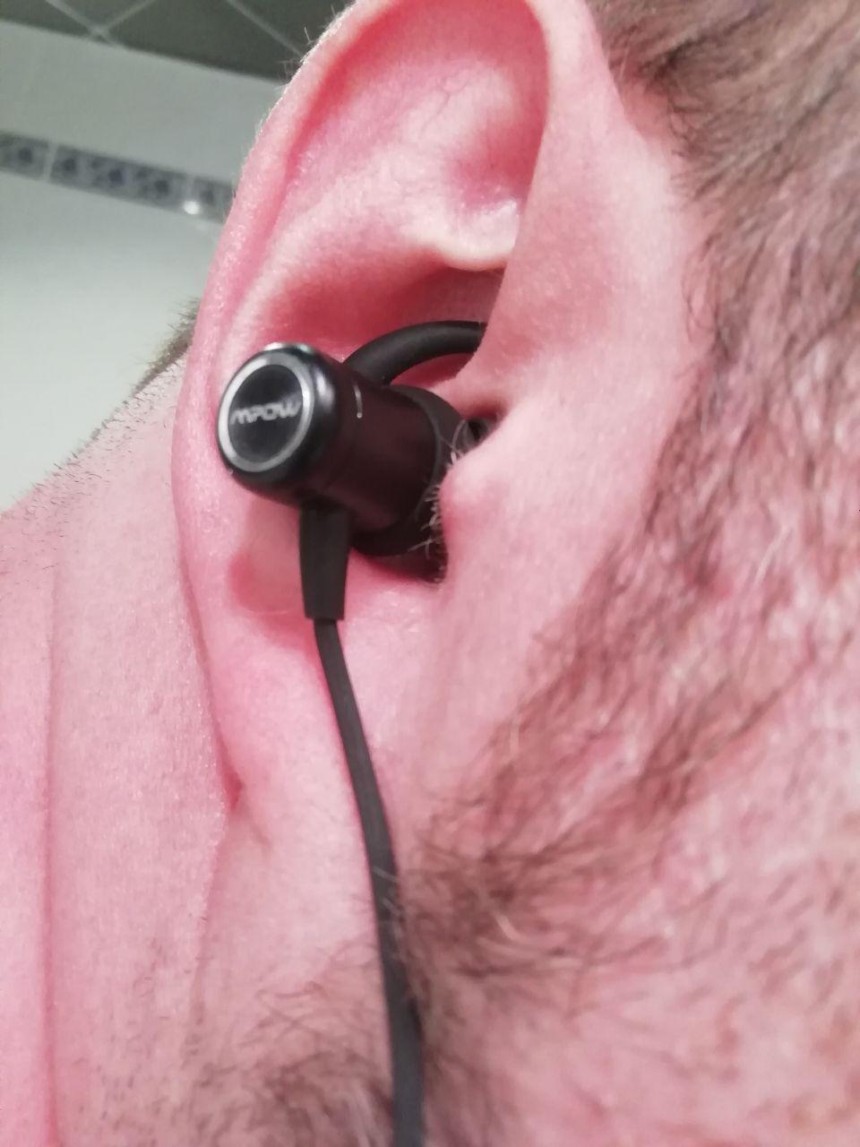 В ушах сидят хорошо, во время бега не вываливаются - особенно если правильно подобрать размеры амбушюр и крючка. Цилиндрики наушников слегка вызывающе торчат из ушей, но дискомфорта при ношении это не вызывает. Как это выглядит с эстетической точки зрения - судите сами по фото.