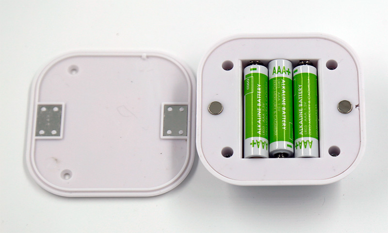 Нижняя крышка - на магнитах, легко снимается (для смены батареек). К ней прикреплен двухсторонний скотч 3М.