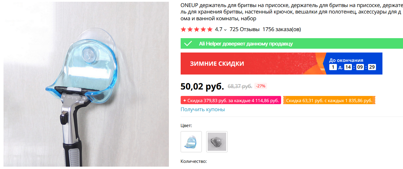 Вот эта штука мне давно была нужна - держатель для бритвы в ванную комнату. Я бритвой-станком бреюсь раз в одну-две недели, станок при этом лежит в подвеске для шампуня и геля, откуда периодически проваливается (она проволочная). Заказал пару штук.