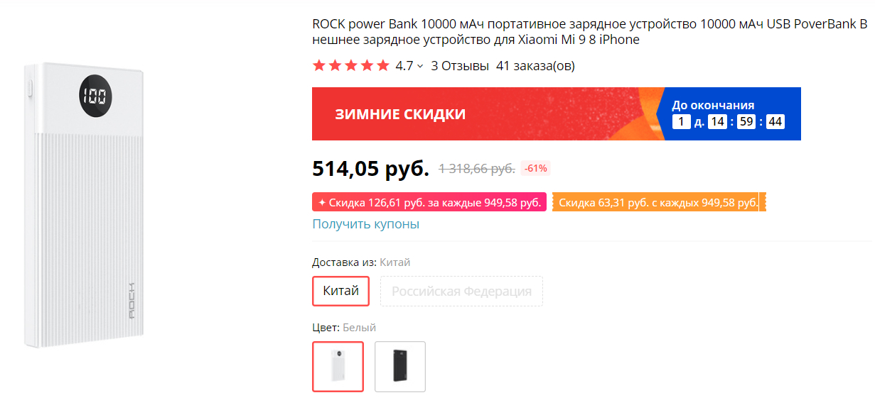 Недорогой повербанк на 10000 мАч на 10 Ватт. Судя по графику, порядка 230 рублей на него действительно скинули.