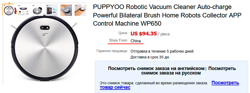 Помните в записи о распродаже на Али обсуждали робот-пылесос Puppyoo wp650 подозрительнго низкой стоимости? Я его заказал - посмотреть, что это вообще такое. Заказывал совершенно точно из Китая, а не со склада в Испании - вот скриншот заказа.