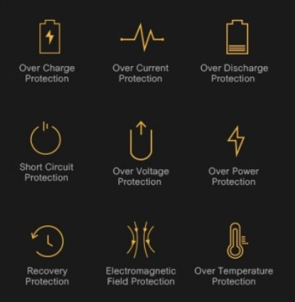Защита от перезаряда, перегрузки по току и мощности, перезаряда, КЗ, превышения напряжения, перегрева.