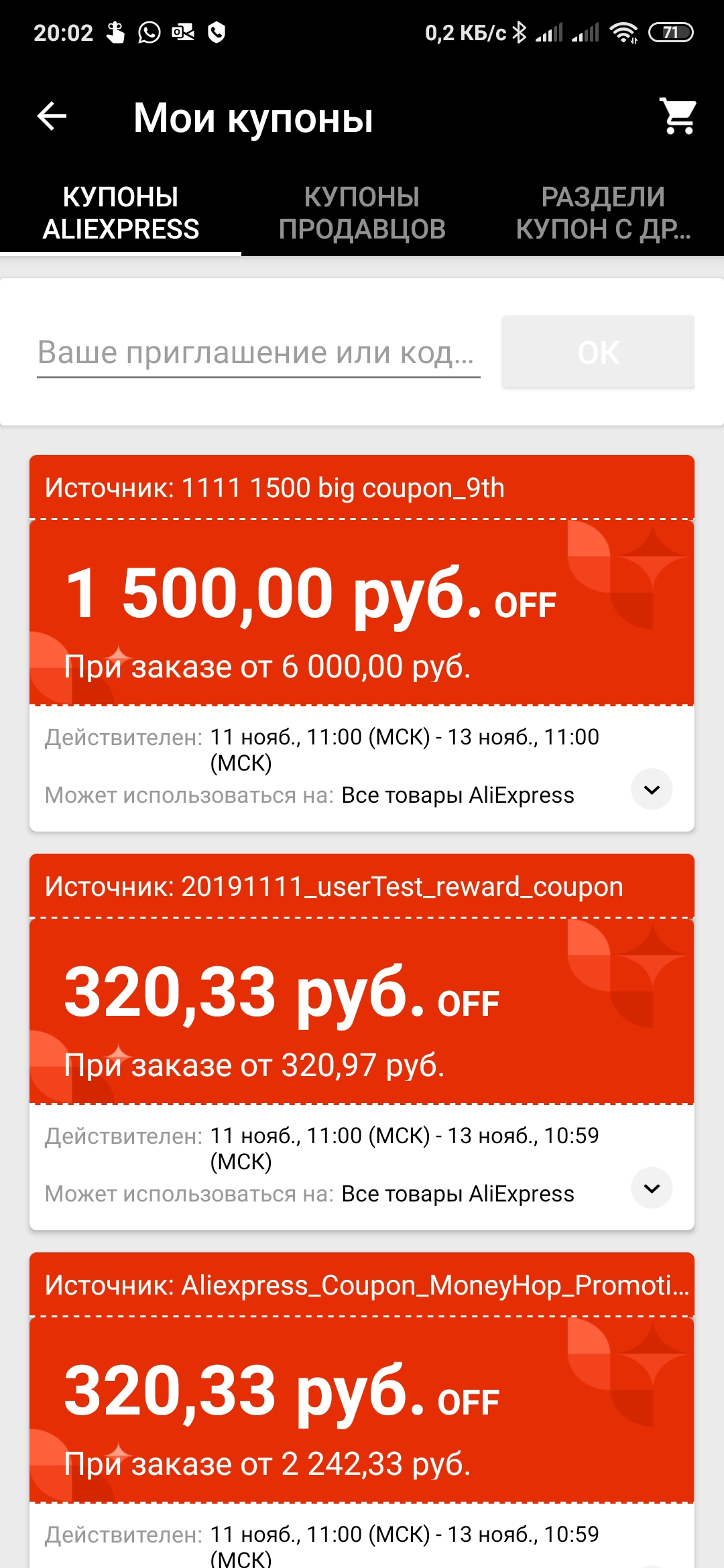 Удалось получить купон Aliexpress на $20 при покупке от $50 в 19-00 по Мск 😄 в приложении на смартфоне.