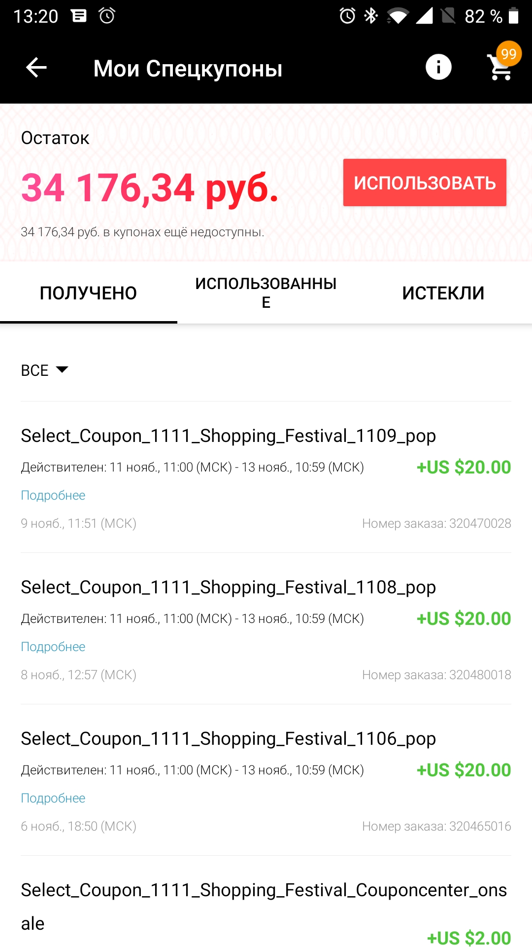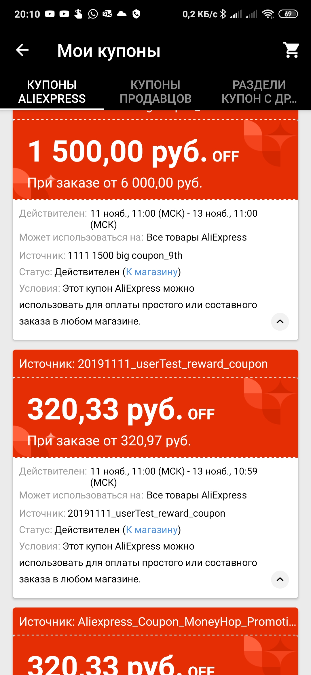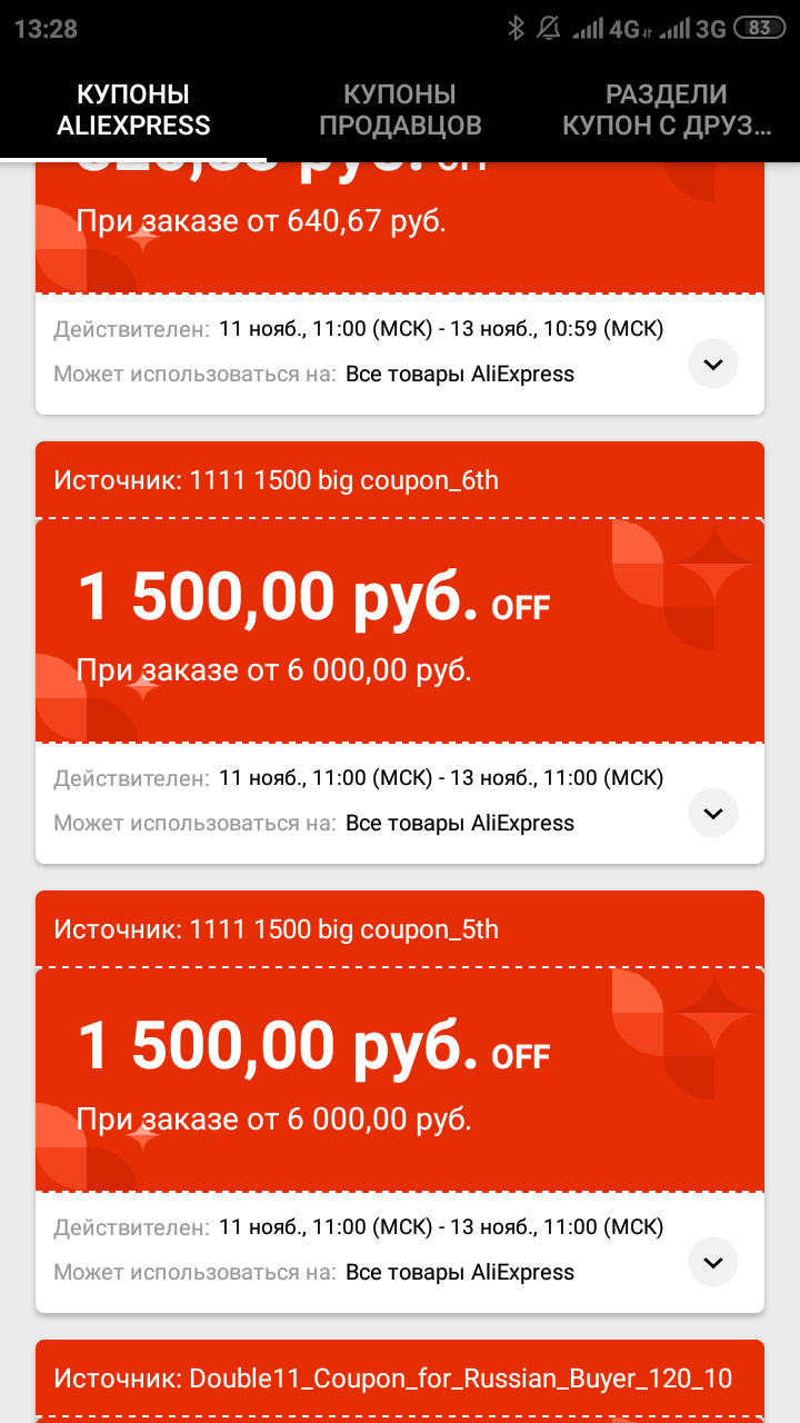 2. Спецкупоны Алиэкспресс (красно-белые) - можно покупать не все товары, чтобы проверить, в корзине выбираете товар для оплаты, смотрите, запустилась ли скидка по спецкупону, если нет, то заходим в своем аккаунте на вкладку купонов -> спецкупоны -> подробнее (в МП в мои спецкупоны -> использовать) и выбираем товар для заказа, на который действуют спецкупоны (сортируется список по Вашим предпочтениям, поиску). Ограничены по времени действия, по сумме заказа (вроде), действует не на все товары, сложно составить список из нескольких товаров (может и не получится), самые непонятные для меня купоны, так и не разобрался толком с их эффективным применением.