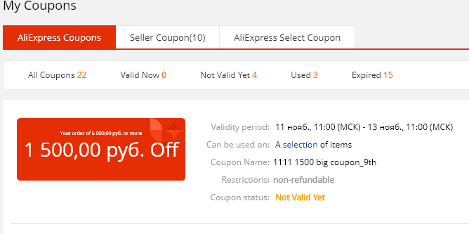В партнерке прислали информацию. Вот здесь каждые два часа раздают купоны на 1500 рублей (действуют при покупке от 6000 рублей). Сегодня раздаются в 13, 15 и 18 часов по Москве. Время там указывается по странному часовому поясу, но сориентироваться можно по таймеру, который там тикает. Количество купонов ограничено, поэтому желательно достаточно точно выдерживать время, чтобы успеть. И обязательно заранее проверьте, что вы залогинены, а то Ali любит разлогинивать по любому поводу.