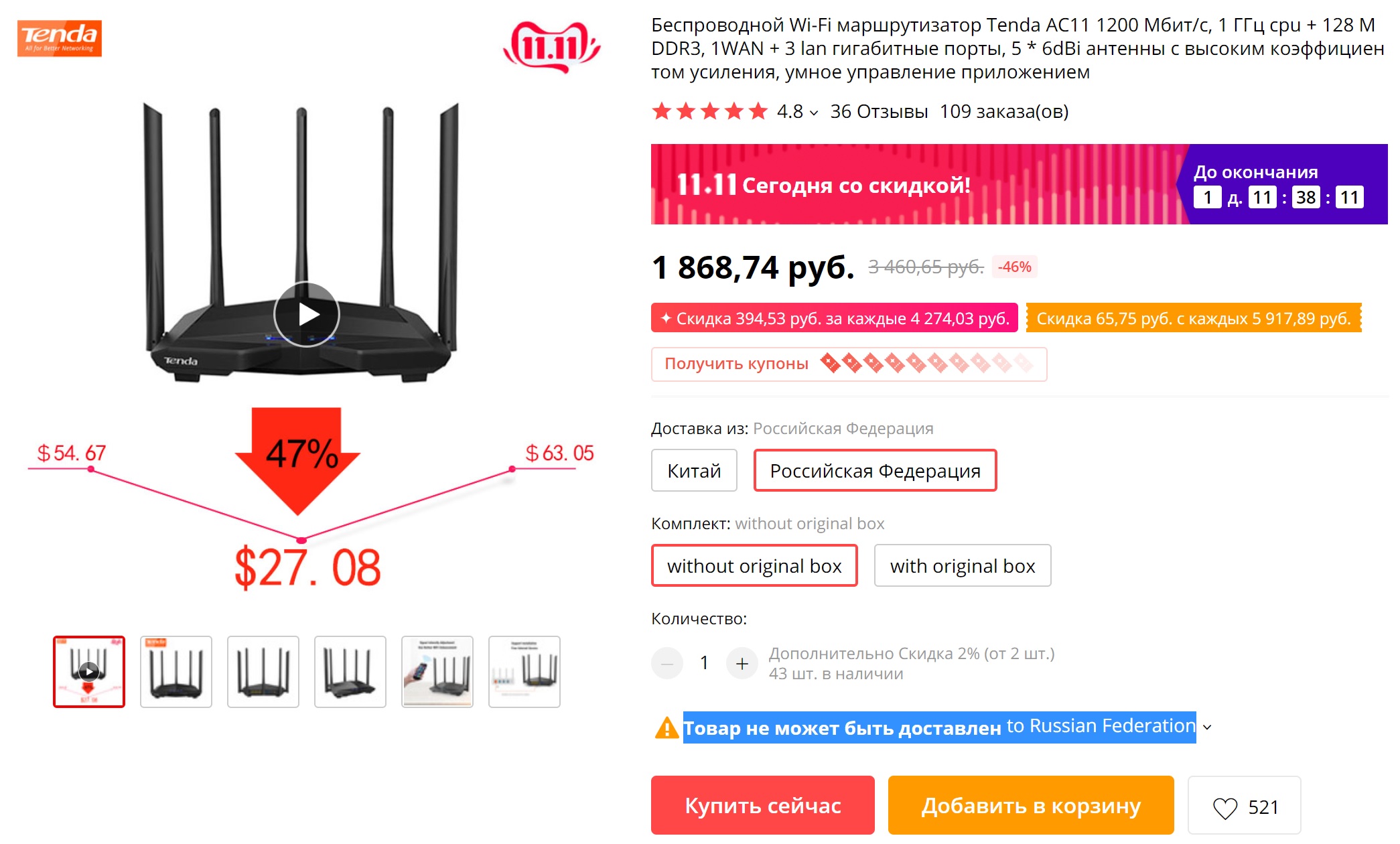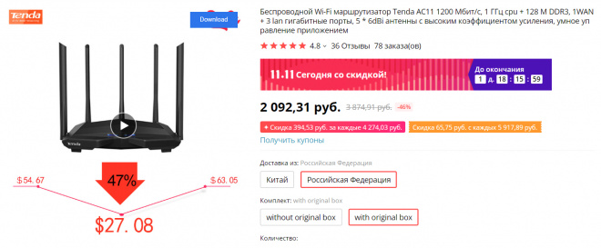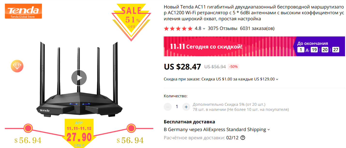 Беспроводной гигабитный двухдиапазонный роутер Tenda AC11 известного производителя по очень интересной цене - 2092 рубля (если в коробке, без коробки еще на 200 рублей дешевле). И доставка из России.