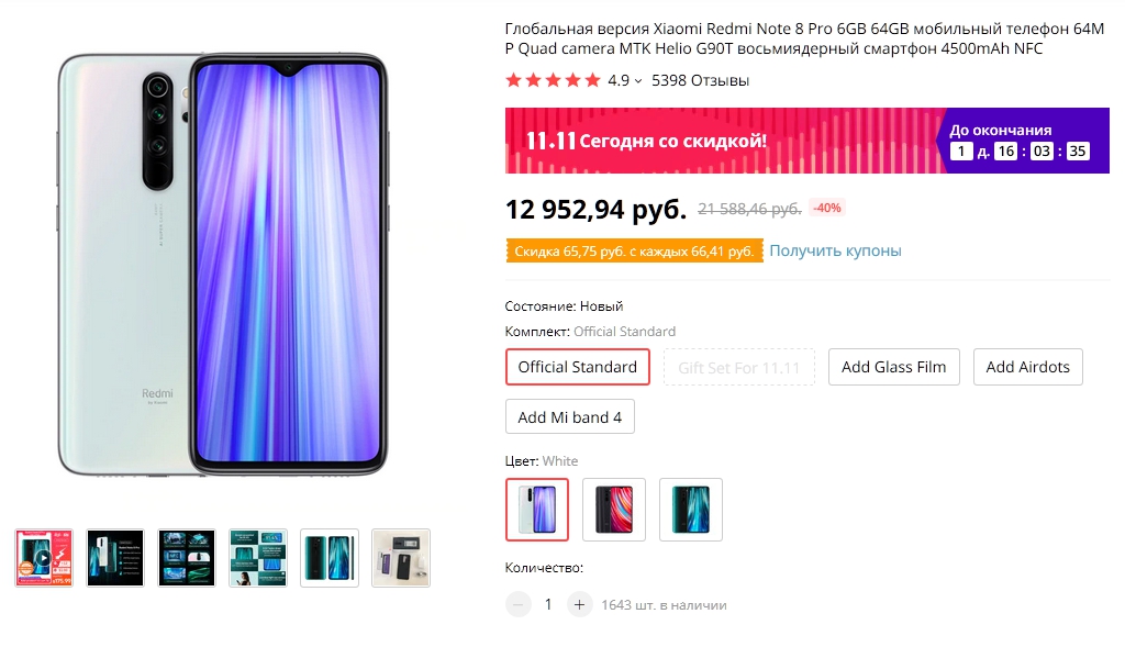 Заказал родственнику Xiaomi note 8 pro зеленый 6/128 за 12800р (14400р без купонов) и чехол за 40 рублей (360р без купонов). У Алекса ссылка на 6/64 и дешевле на 1к руб., тут, думаю, смысла нет экономить на памяти.