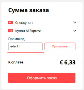 Первый код - exlernew11, второй код - exler11. Пользуйтесь на здоровье. Как использовать?  Перейти на Aliexpress, там зарегистрироваться (если вы новый пользователь), выбрать товар, добавить в корзину, при оплате ввести код (только сумма покупки должна удовлетворять условию) и нажать "Применить".