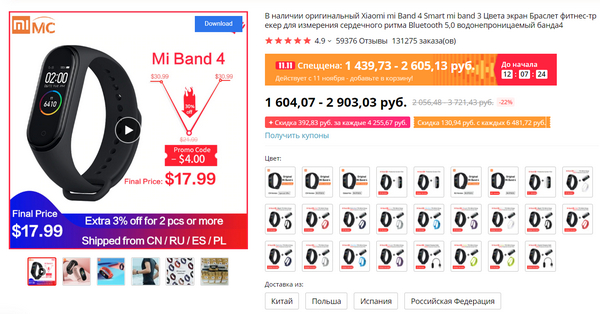 Что еще привлекло внимание? Отличный фитнесс-браслет Xiaomi Mi Band 4  (мой обзор) - cкидка копеечная, но он сам по себе стоит копейки, а там есть куча вариантов комплектации.