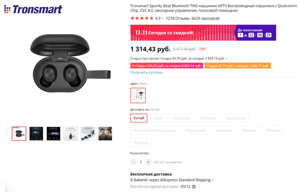Еще более дешевый вариант TWS-наушников от известного производителя - Tronsmart Spunky Beat. Обычная цена на них - порядка 2 тысяч. Сейчас 1314 рублей. Поддержка aptX и AAC, влагозащита IPX5, автономность до 7 часов (до 24 часов при зарядке от кейса), также у кейса есть коротки кабель с USB 2.0, что позволяет его подключать к порту USB компьютера без дополнительных проводов. Управление сенсорное. Я себе заказал потестировать.