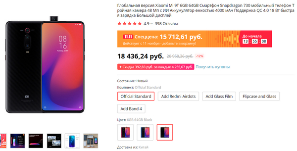 Очень интересная модель Xiaomi Mi 9T - 15721 рубль. Отличный смартфон - вот мой обзор. Смартфон тогда стоил 24 тысячи, тоже почти на 10 тысяч цена ниже. Ну и спецкупонами на сайте магазина можно еще 1200 рублей собрать. Плюс промокод ALISALE10 должен дать еще скидку на 640 рублей.