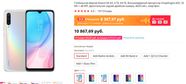 Смартфон Xiaomi Mi A3 - всего 8367 рублей. Да, у него разрешение экрана не фонтан, но остальные-то характеристики хорошие плюс камера на 48 Мпикс и емкий аккумулятор. И для него есть промокод BIGSALE11 (не знаю, на сколько скидку дает).
