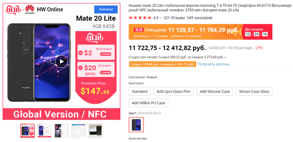 Ну и замечу, что цена на Mate 20 lite, который 6/64, IPS FHD+, NFC, отличная двойная камера с шириком, аккумулятор 3750 мАч с быстрой зарядкой на 18 Ватт - сейчас всего 11129 рублей. Да, скидка копеечная, но сама цена за такой агрегат - вполне достойная, как я считаю.