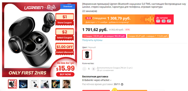 TWS-наушники Ugreen - 1308 рублей. Только SBC, но производитель хороший, так что должен быть вариант неплохой. Тоже, наверное, закажу попробовать.