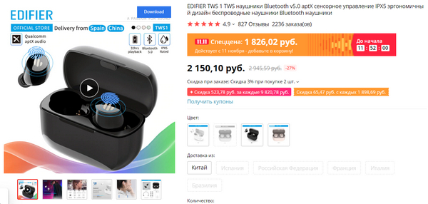 TWS-наушники дешевле 2 тысячи рублей с aptX - EDIFIER TWS 1 за 1862 рубля. Я себе прям заказал потестировать, хотя мне всяких разных наушников едет - уже штук десять. На эти отзывы неплохие, надо самому тестировать.