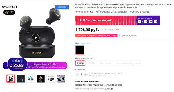 TWS-наушники с aptX Wavefun XPods 3 - всего за 1708 рублей. Цена реально заметно снижена, я проверил по графику. Влагозащита IPX7, 6 часов автономной работы (до 30 при зарядке от кейса),чип Qualcomm QCC3020, Bluetooth 5.0 с функцией TrueWireless Stereo Plus (обеспечивает стабильность подключения и уменьшает задержку при передаче звука). Управление сенсорное.