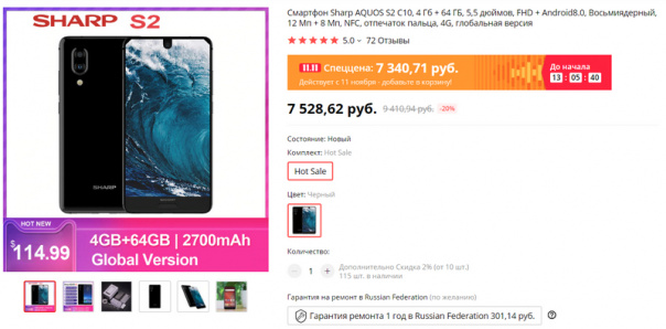 Из дешевых, совсем неновых (осень 2017 года), но вполне заслуживающих вариантов смартфона - Sharp AQUOS S2 за 7340 рублей. Причем за эти деньги тут 6/64 ГБ, очень неплохая платформа Snapdragon 630, NFC (!), сканер отпечатка спереди на кнопке, IPS-дисплей FullHD. Старичок, но более чем достойный старичок. В котором, кстати, "капля" селфи-камера появилась, насколько я помню, самой первой.