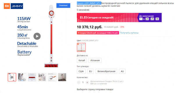 Тоже рекомендованное - беспроводной пылесос Xiaomi LEXY JIMMY JV51 - 10370 рублей. Цену снизили на 1,5 тысячи.