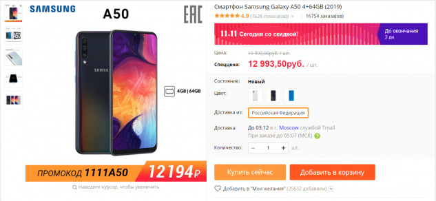 Еще один хороший смартфон со здорово сниженной ценой и промокодом - с гарантией и доставкой из России. Samsung Galaxy A50 4+64GB - 12194 рубля (с промокодом 1111A50).