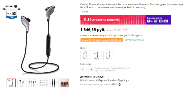 Порекомендовали вот эти наушники за 1546 рублей - я себе сразу заказал поизучать. Во-первых, поддерживают aptX. Про AAC не пишут, но подчеркивают, что для айфонов подходят. Во-вторых, это не затычки: наушники просто располагаются в ушной раковине и держатся с помощью резинового крючка - мне такие больше нравятся, чем затычки. Ну и выглядят хорошо.