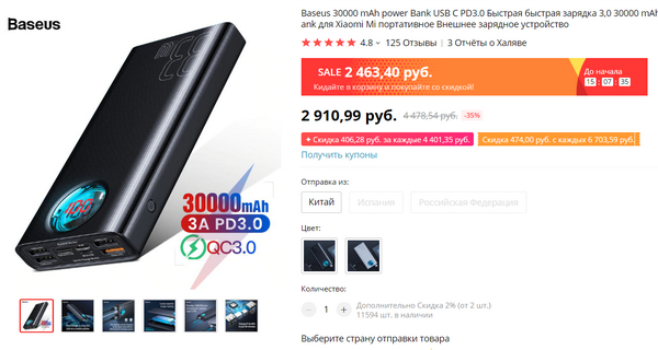 Для тех, кому актуальны ёмкие внешние батареи для зарядки всевозможных устройств, включая ноутбуки через PD - Baseus выпустили крутую батарею на 30000 мАч с дисплеем-индикатором и кучей портов: три USB, USB для QC 3.0, два Type-C  и Type-C для PD 3.0. Выглядит классно, Baseus - бренд хороший. И скидка в 500 рублей для цены в 2900 - уже неплохо.