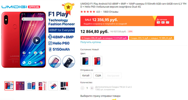 Смартфон UMIDIGI F1 Play - явный конкурент Xiaomi Redmi Note 7, при этом по некоторым параметрам покруче будет (кроме платформы, которая очень похожая).  Скидка на него всего 500 рублей, но смотрите характеристики за 12300 рублей: дисплей 6,3 IPS 2340x1080, платформа MediaTek Helio P60, чистый Android 9.0, памяти 6/64, NFC(!), камера 48 Мпикс (Sony IMX586) + 8 Мпикс (размытие), аккумулятор 5150 мАч и с комплектным зарядным устройством на 18 Ватт.