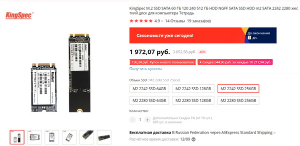 Совсем недорогие китайские SSD M.2 (обратите внимание, что это не Kingstone, а KingSpec). 256 ГБ - 1972 рубля. Читатель, который порекомендовал, заказывал, говорит, нормально работают. Для ноутов расширить память - самое оно.