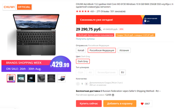 На Chuwi Aerobook дали хорошую скидку - порядка 10%. Читал на 4PDA отзывы на него - в основном, хорошие. 13,3" IPS FullHD, Intel Core M3 6Y30,  8/256 ГБ SSD, тонкие рамки дисплея, корпус из алюминиево-магниевого сплава, лицензионная Windows 10, большая клавиатура, два USB 3.0, кардридер и Type-C, 38 Ватт батарея (до 8 часов работы), вес - 1,3 кг. Давно к нему присматриваюсь - и на обзор хотел, и жене пора менять ее древний MacAir 128 ГБ, а в свой дом никакой макбук я больше не буду брать по определению, этот MacAir достал не по-детски (и меня, и жену, что характерно). Есть поставка с российского и испанского склада, обещают послепродажное обслуживание в России и Испании. Всё, беру - там доставка из Испании, так что довольно скоро будет обзор.