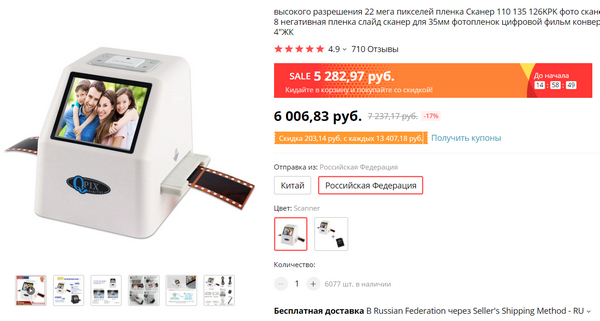 Ну и вот тут хорошая скидка на сканер для фотопленок: цифрует одной кнопкой и скидывает прямо на SD-карту. Если до сих пор не оцифровали старые плёнки - есть шанс это сделать. Неплохая скидка (700 рублей) и есть доставка с российского склада.